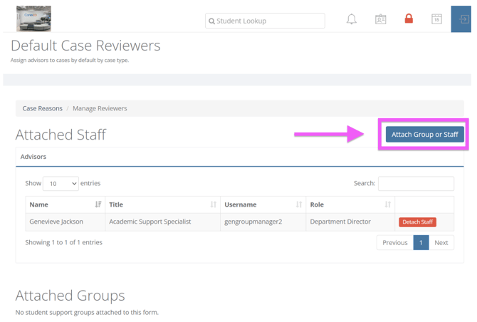 On the Default Case Reviewers page, click on the Attach Group or Staff button: