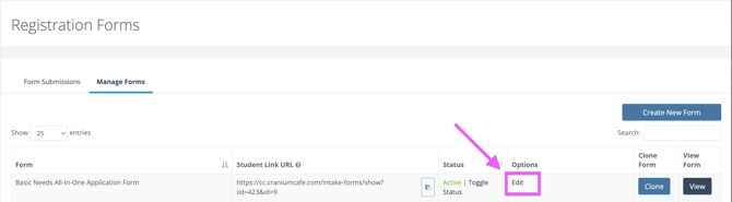 Once you are on the Edit Registration Forms page, you will see the Manage Options button: