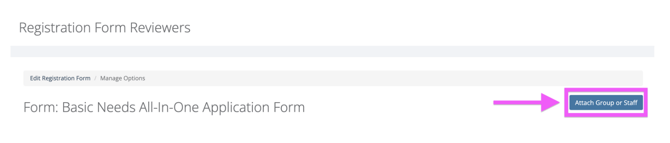On the Registration Form Reviewers page, you can easily assign either a Group or an individual Staff member to review the form by clicking on the Attach Group or Staff button: